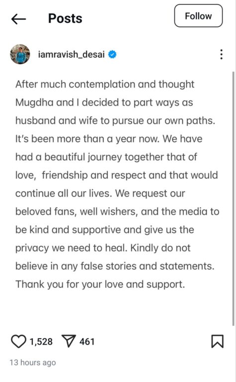 On 5 April 2025, television actress Mugdha Chaphekar and actor Ravish Desai announced their separation after nine years of marriage. Ravish shared on social media that the couple had been living separately for the past year and had now mutually decided to part ways with understanding and respect.